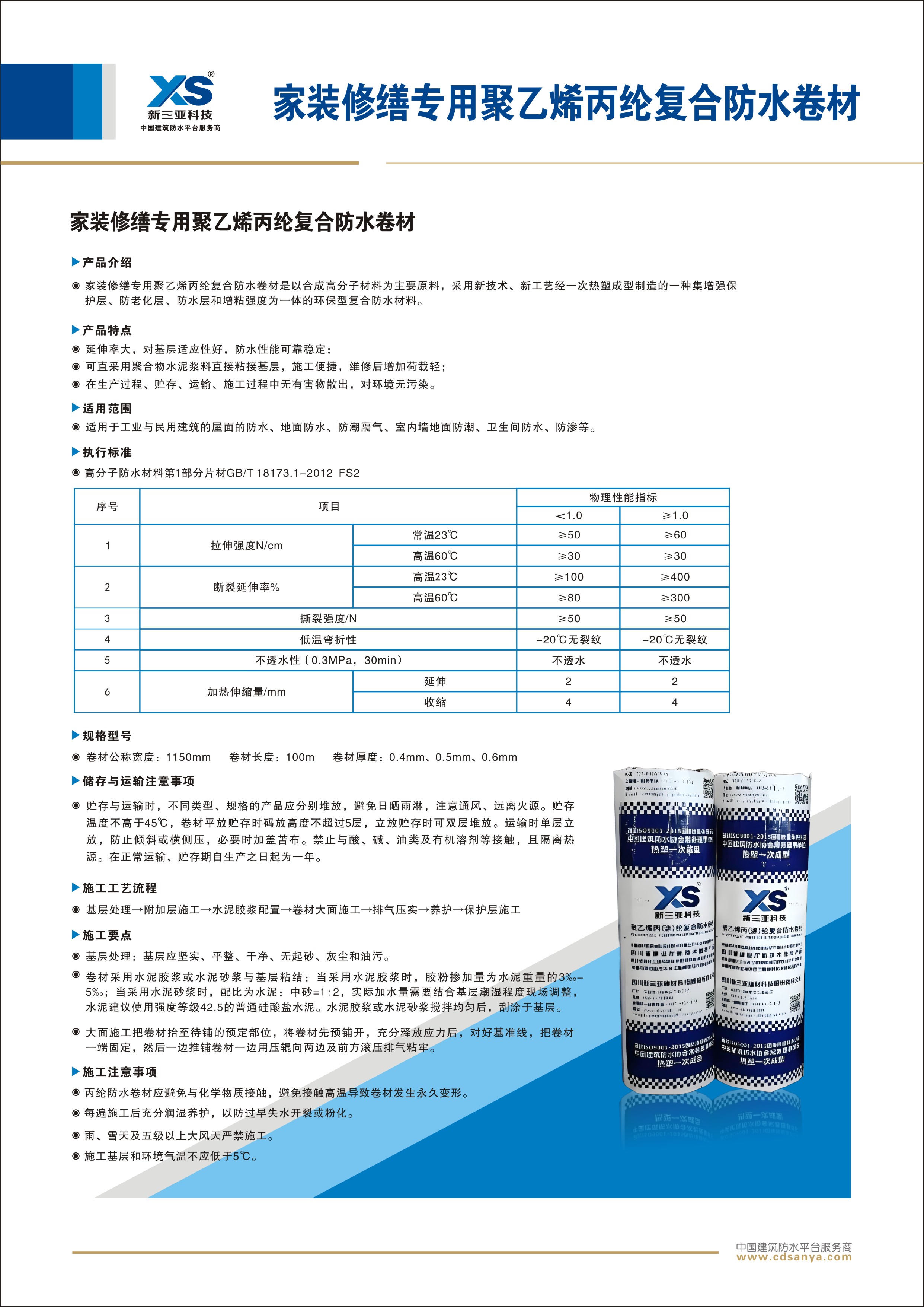 | 產(chǎn)品簡介: 乙烯丙綸復(fù)合防水卷材是以合成高分子材料為主要原料,采用新技術(shù)、新工藝經(jīng)一次熱塑成型制造的一種集增強(qiáng)保護(hù)層、防老化層、防水層和增粘強(qiáng)度為一體的環(huán)保型復(fù)合防水材料。 規(guī)格: FS2-PE-0.6mm 1.15m×100m |  |  |