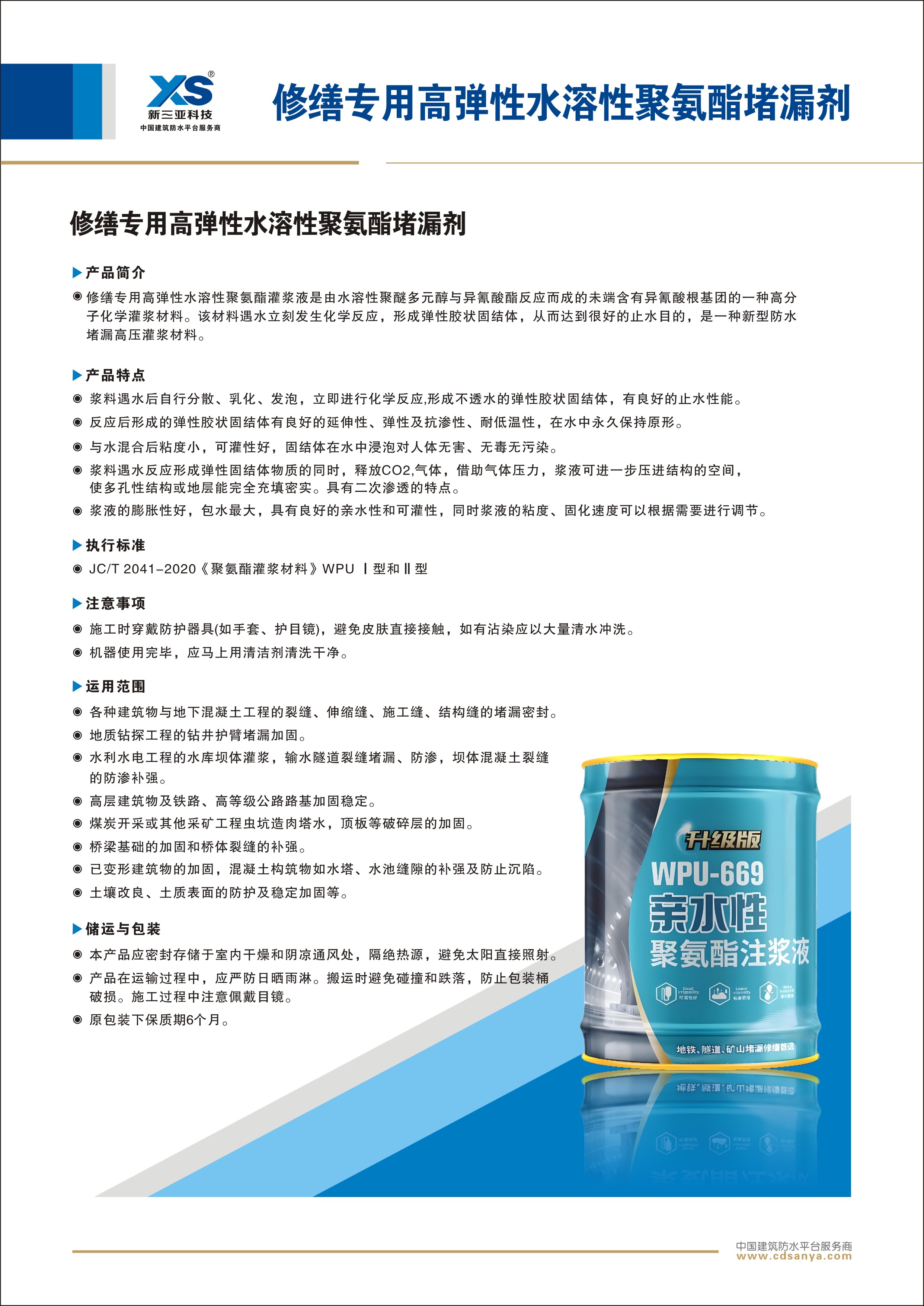 | 產(chǎn)品簡(jiǎn)介: WPU-669水溶性聚氨酯灌漿液是由水溶性聚醚多元醇與異氰酸酯反應(yīng)而成的未端含有異氰酸根基團(tuán)的一種高分子化學(xué)灌漿材料。該材料遇水立刻發(fā)生化學(xué)反應(yīng),形成彈性膠狀固結(jié)體,從而達(dá)到很好的止水目的,是一種新型防水堵漏高壓灌漿材料。 規(guī)格型號(hào): 按產(chǎn)品性能分為Ⅰ型和Ⅱ型 包裝: 7kg/桶 |  |