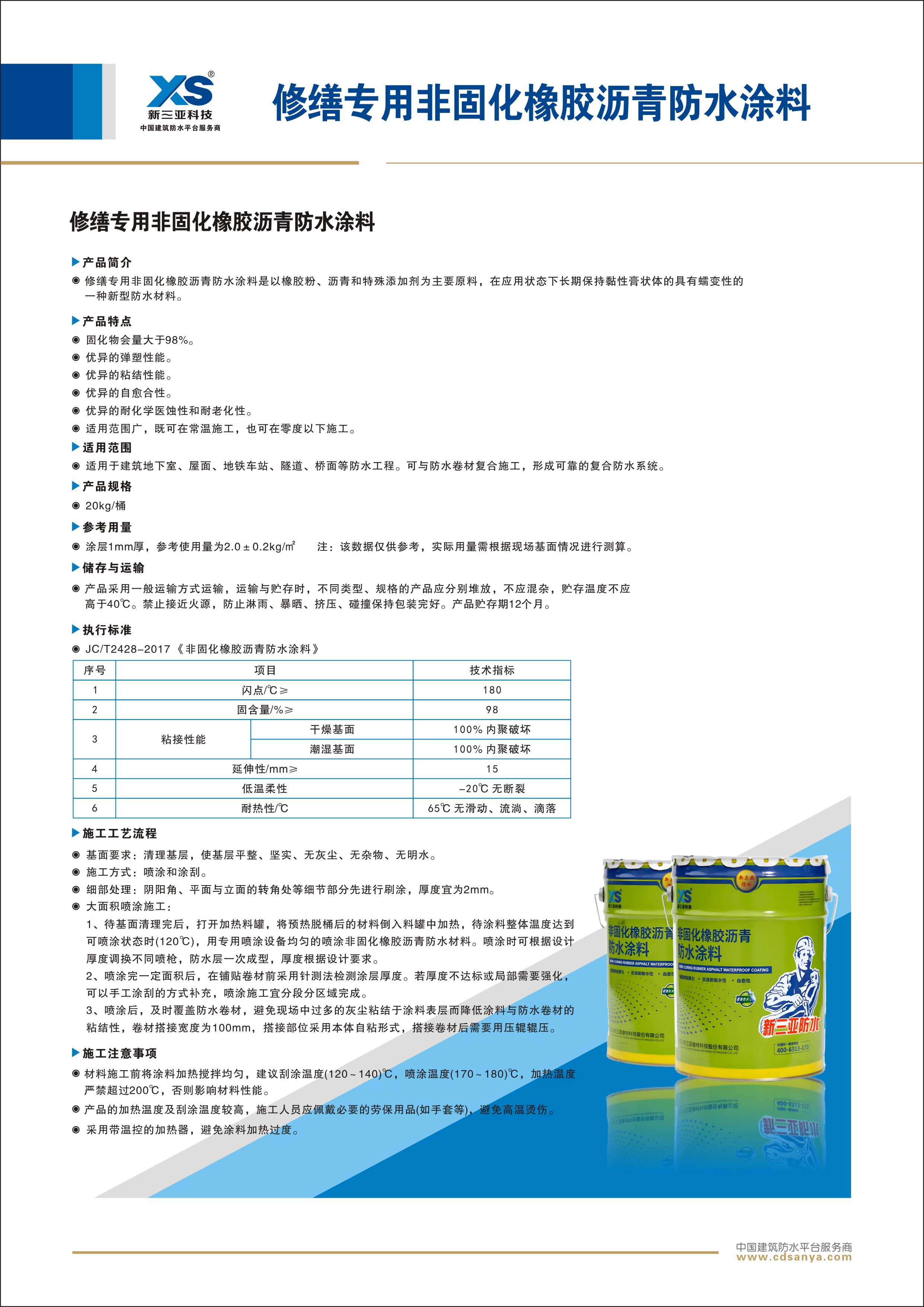 | 產(chǎn)品簡(jiǎn)介: 修繕專用非固化橡膠瀝青防水涂料是以橡膠粉、瀝青和特殊添加劑為主要原料,在應(yīng)用狀態(tài)下長(zhǎng)期保持黏性膏狀體的具有蠕變性的一種新型防水材料。 規(guī)格:20kg/桶 |  |