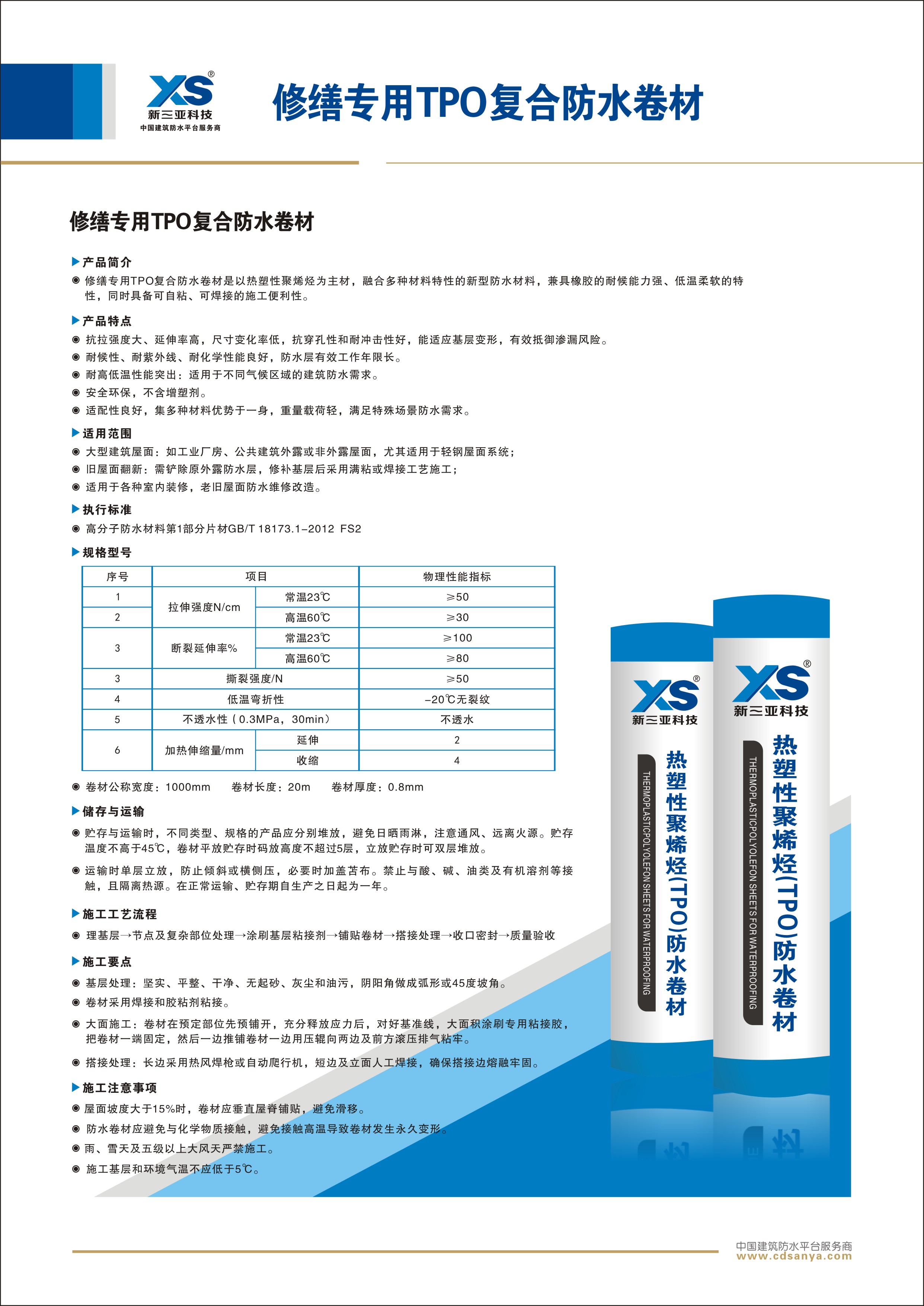 | 產(chǎn)品簡介: 修繕專用TPO復合防水卷材是以熱塑性聚烯烴為主材,融合多種材料特性的新型防水材料,兼具橡膠的耐候能力強、低溫柔軟的特性,同時具備可自粘、可焊接的施工便利性。 規(guī)格:FS2-TPO-20.0m×1.15m×0.8mm |  |
