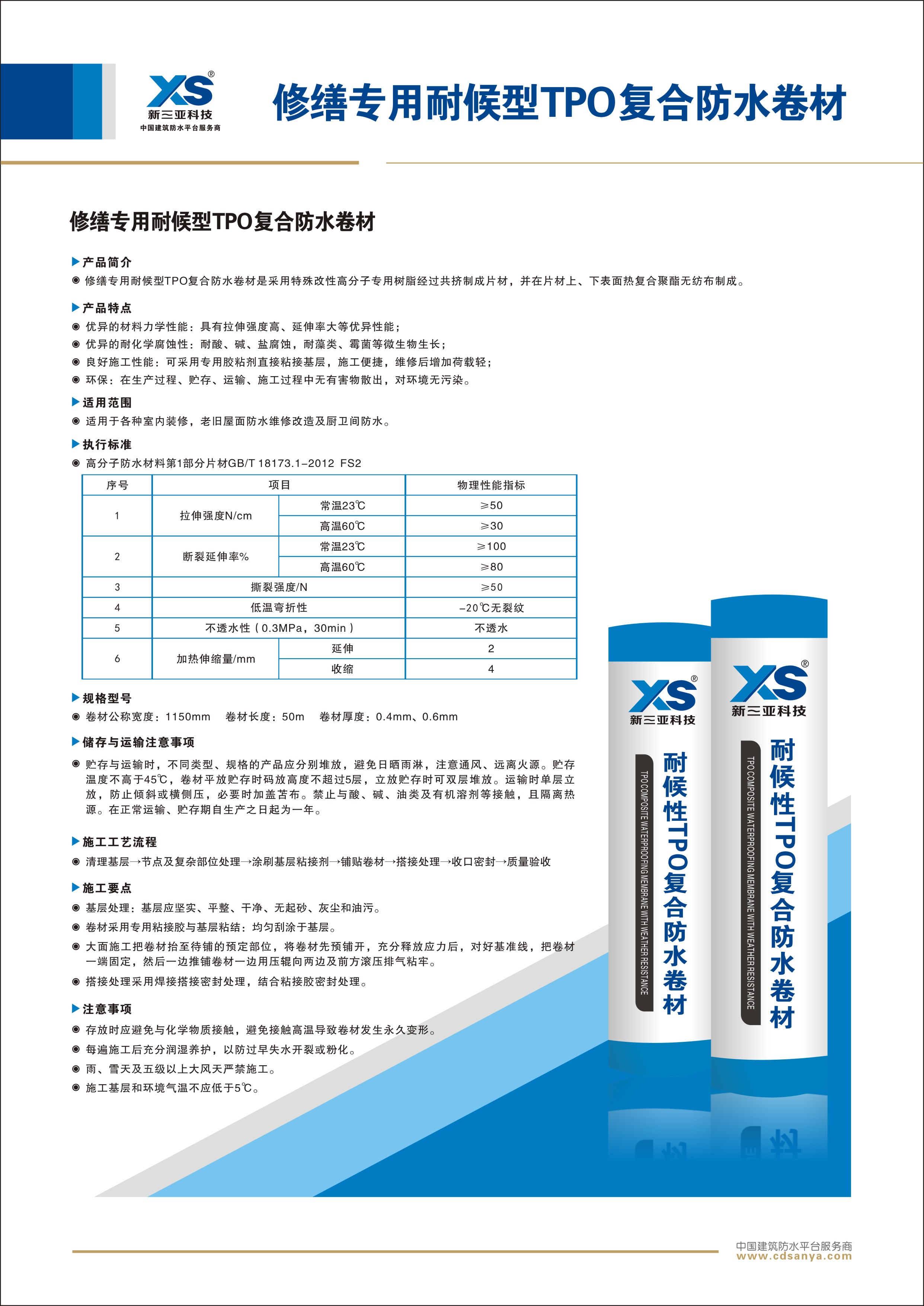 | 產(chǎn)品簡(jiǎn)介: 修繕專用耐候型TPO復(fù)合防水卷材是采用特殊改性高分子專用樹脂經(jīng)過(guò)共擠制成片材,并在片材上、下表面熱復(fù)合聚酯無(wú)紡布制成。 規(guī)格:FS2-TPO-50.0m×1.15m×0.6mm |  |